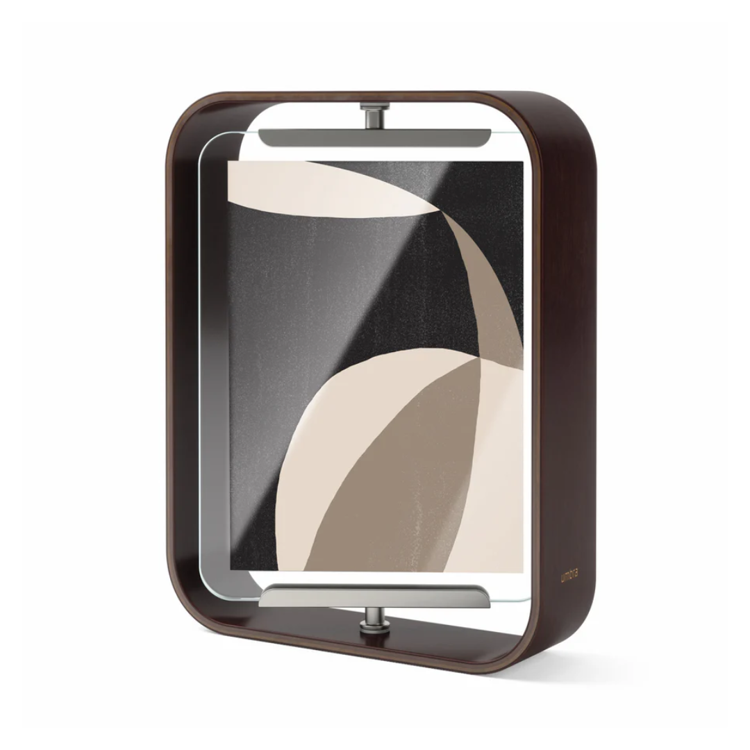 The Umbra Bellwood Desk Frame 4"x6" in Aged Walnut is a stylish and eco-friendly picture frame designed to enhance your home or office décor. Crafted from sustainable walnut ash wood, this frame not only offers a natural aesthetic but also supports environmental responsibility. This double-sided frame enables the display of two pictures simultaneously, enhancing its functionality. The natural variations in tone, texture, and grain of the wood ensure that each frame is unique.