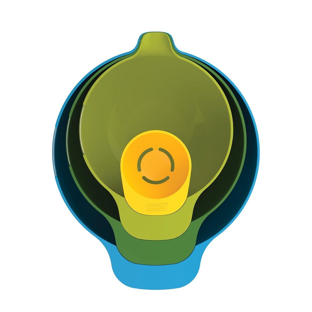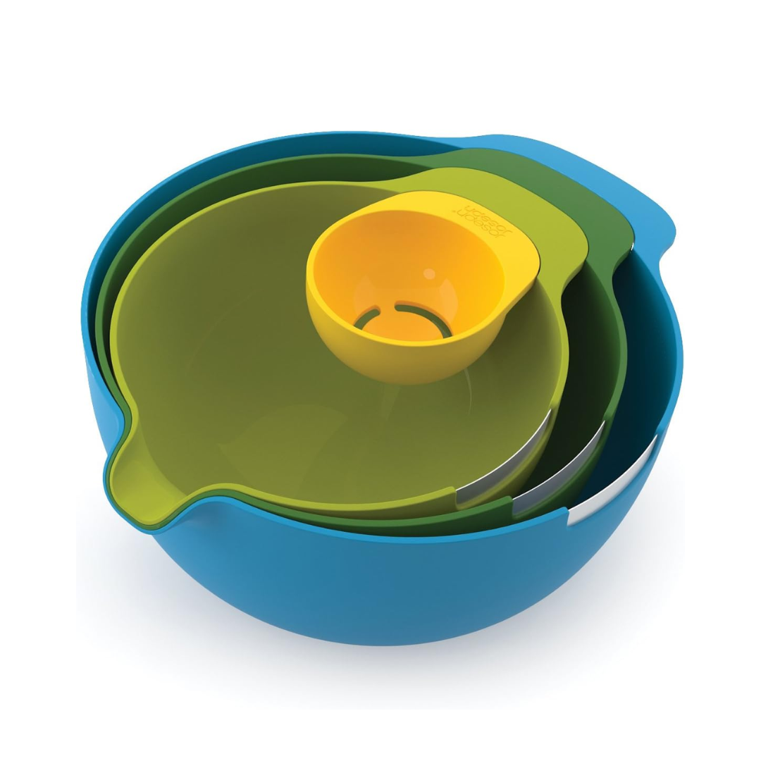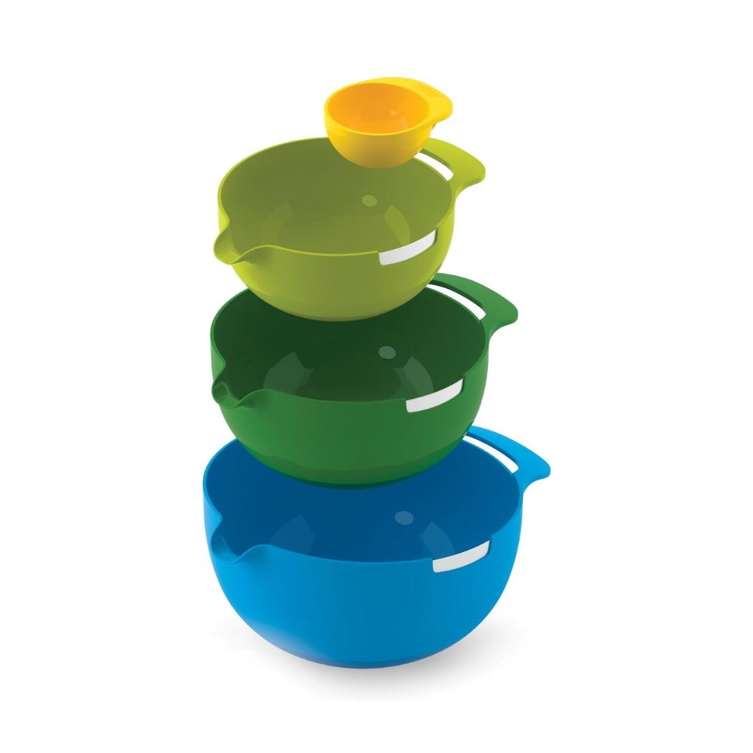 - Four-piece nesting mixing bowl set with integrated egg yolk separator.