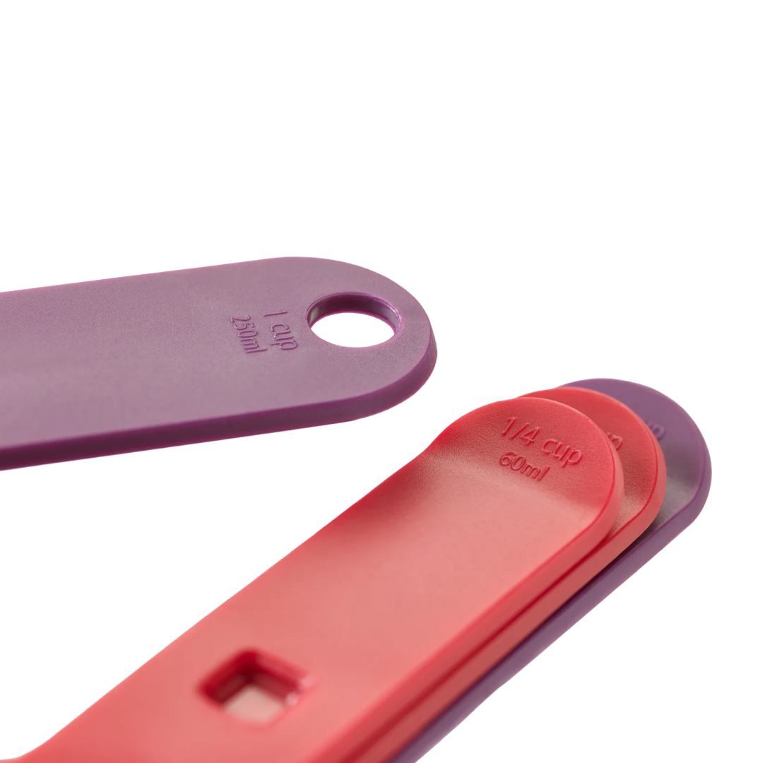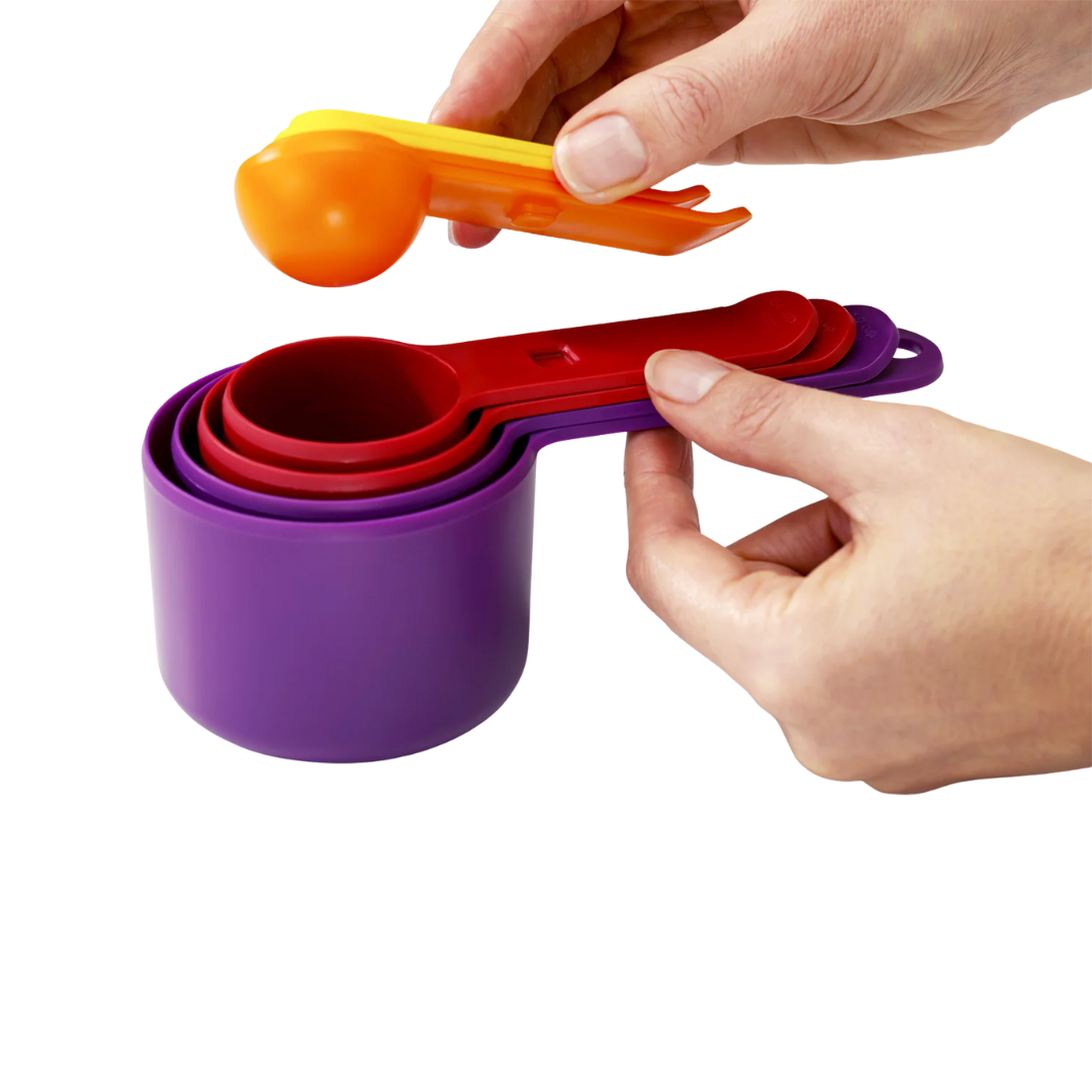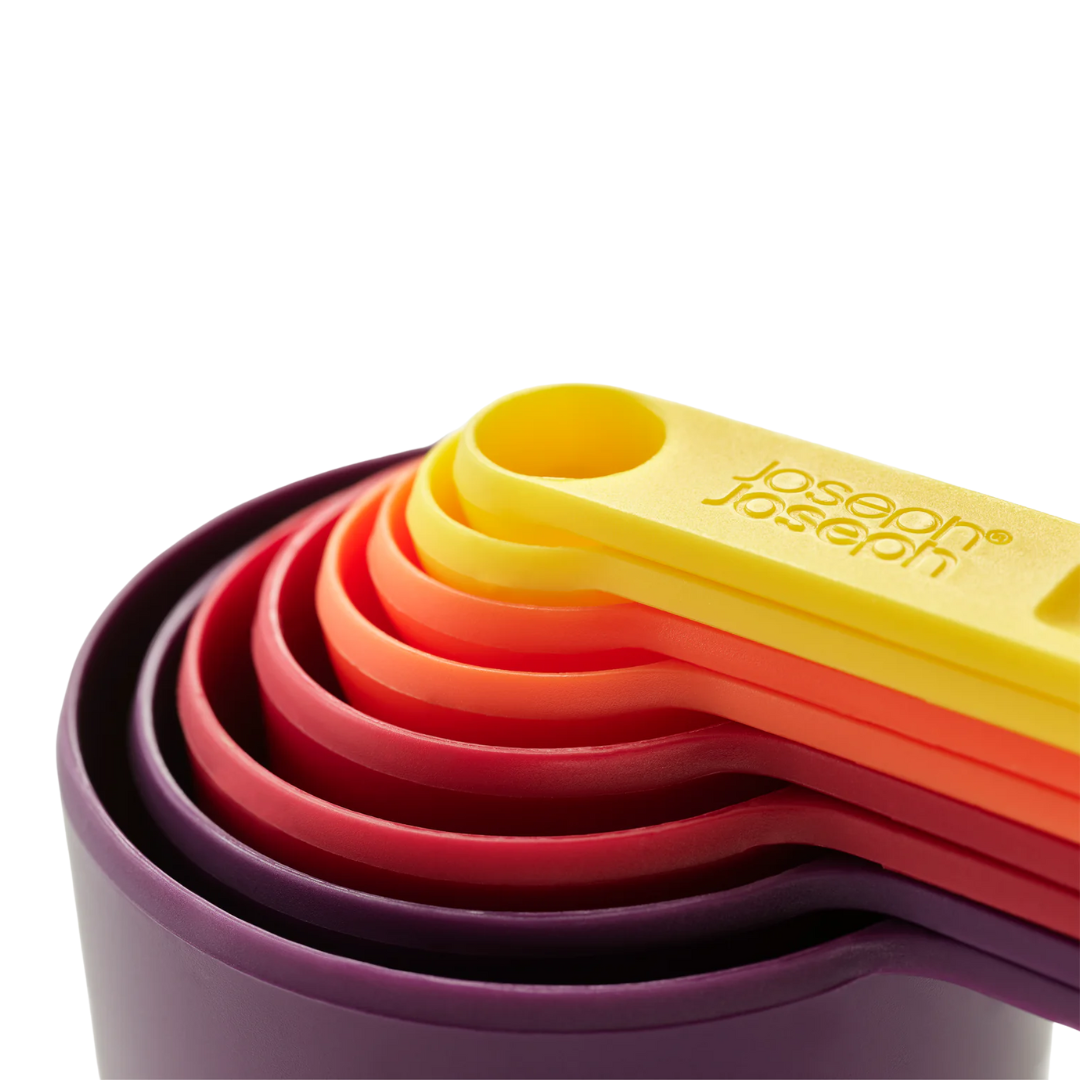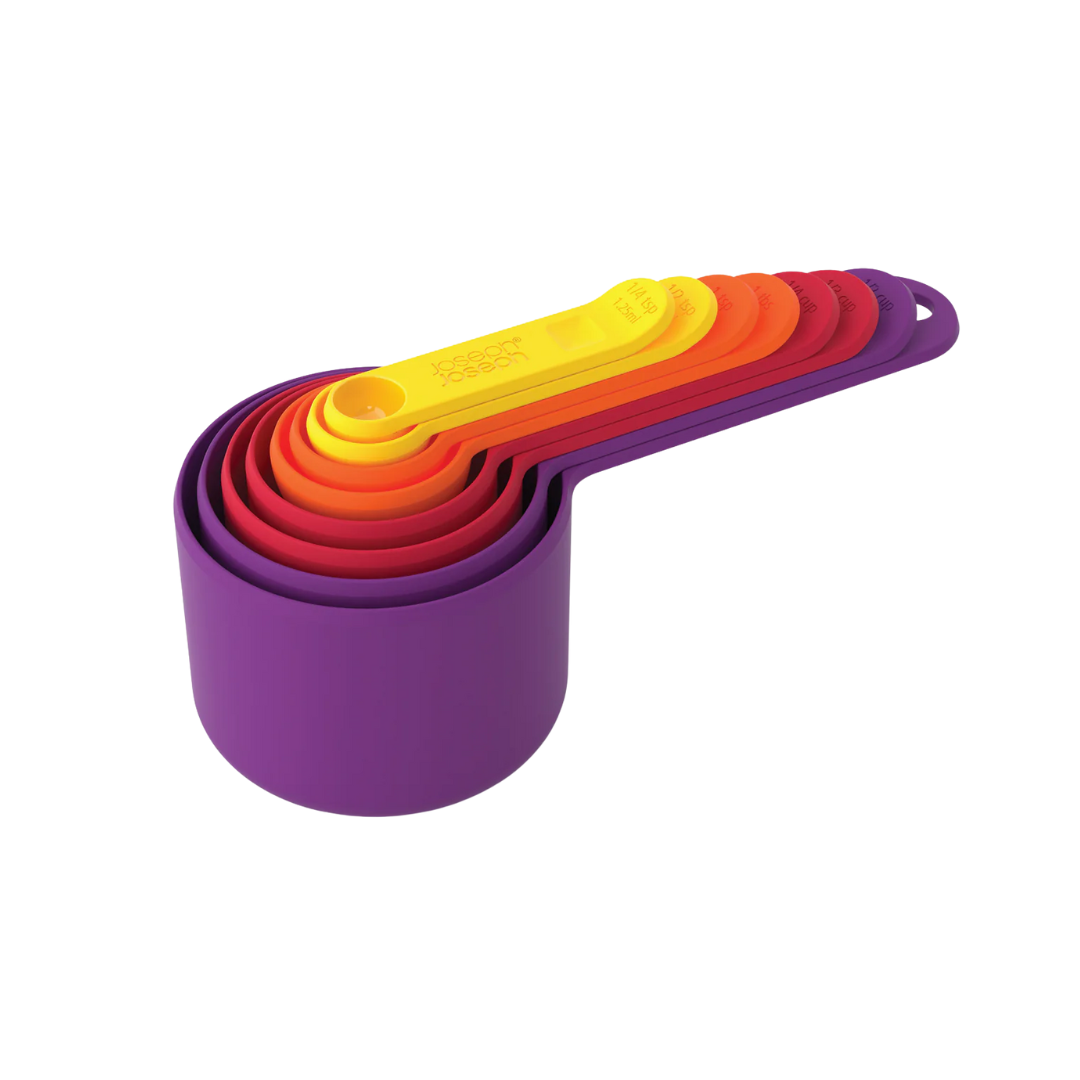 Aprons at the ready! Nest™ Measure brings together eight measuring cups in one space-saving design, so you can cook and bake with more efficiency. The measuring cups range in size from ¼ tsp (1.25ml) up to 1 cup (250ml) and stack neatly together to take up minimal room in your drawer or cupboard.